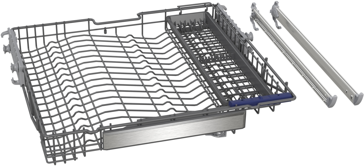 • Flexibles Seitenelement: ermöglicht eine variable Einstellung und gleichmäßige Beladung des Oberkorbs mit langstieligen Gläsern • Wellenförmiges Design gegen Verrutschen und Umkippen • Herausnehmbare Messerablage: verhindert das Herausrutschen von Messern